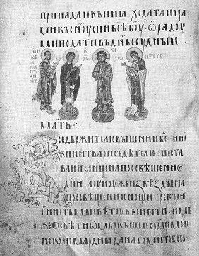 1372 award grant. One of the very few with illuminations, it has a very formal uncial hand reminiscent of the great Russian psalters (see below). The illustration is based on the Deesis - Christ flanked by Mary and John the Baptist and other appropriate saints.