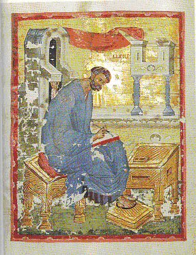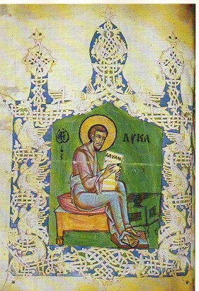 Mstislav Lectionary - 12th century. Novgorod image of St. Luke. Lots of gold leaf, more intricate borders.