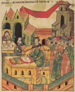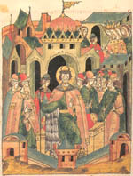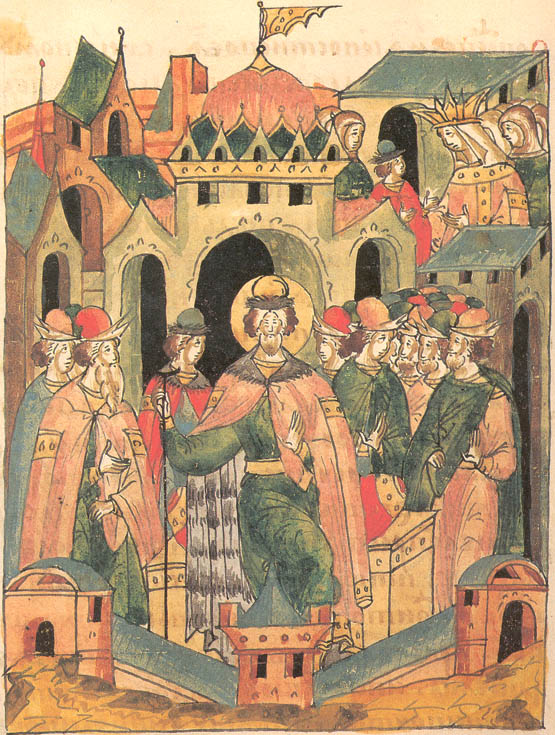This most Orthodox and noble Grand Prince Aleksandr Iaroslavich, greatly adorned by God, and worthy of praise; who was in the eighth generation from the sovereign Tsar and Grand Prince, Vladimir Sviatoslavich, Equal to the Apostles, that had enlightened the land of Rus by holy baptism, and in the eleventh generation from Riurik; did earn by his virtues high and honorable praise not only from men but even from God himself. Early in life, as a child of tender years, he was trained in all that is good by his pious father, the sovereign Prince Iarostav Vsevolodovich of godly wisdom, and by his saintly mother, the God-loving Princess Feodos'ia, named Efrosin'ia as she took her vows. And he was also taught by them to follow all good precepts. And so the fear of God was lodged in his heart together with the yearning to respect God's commandments and keep them in everything, and he held in great esteem both priests and monks.