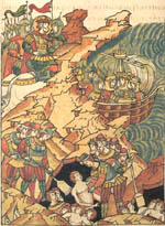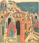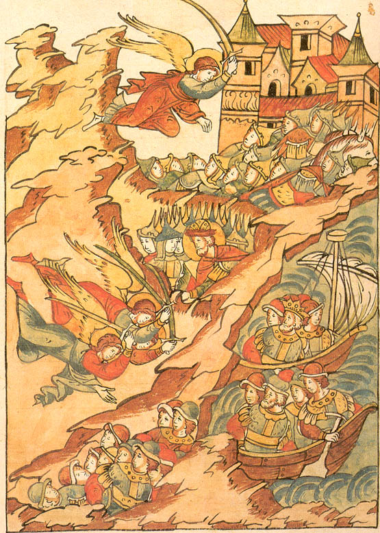 And there happened at that time a wondrous miracle, as in the days of antiquity, during the reign of King Hezekiah, when Sennacherib, King of Assyria, waged war against Jerusalem, wishing to capture the holy city. And suddenly the angel of the Lord went forth, and stew a hundred and eighty-five thousand in the host of the Assyrians. And when men arose in the morning, they found only the bodies of the dead. Thus was it too after the victory of Grand Prince Aleksandr Iaroslavich; when he vanquished the king, great multitudes struck down by God's angels were found dead on the opposite bank of the Izhora River, where the troops of Grand Prince Aleksandr Iaroslavich had not been; even there lay many bodies of the slain.