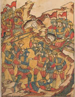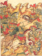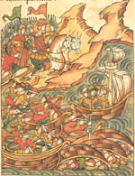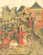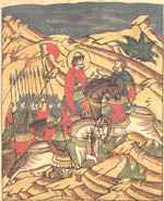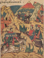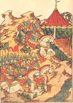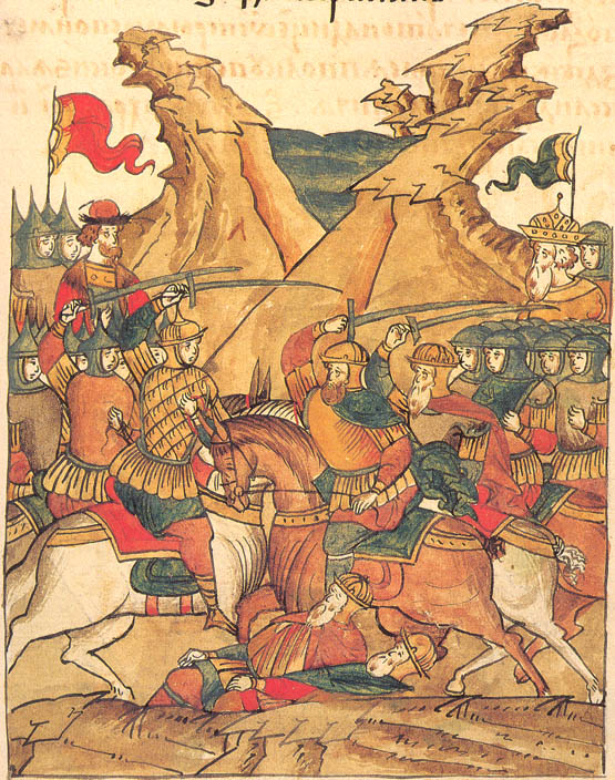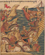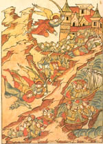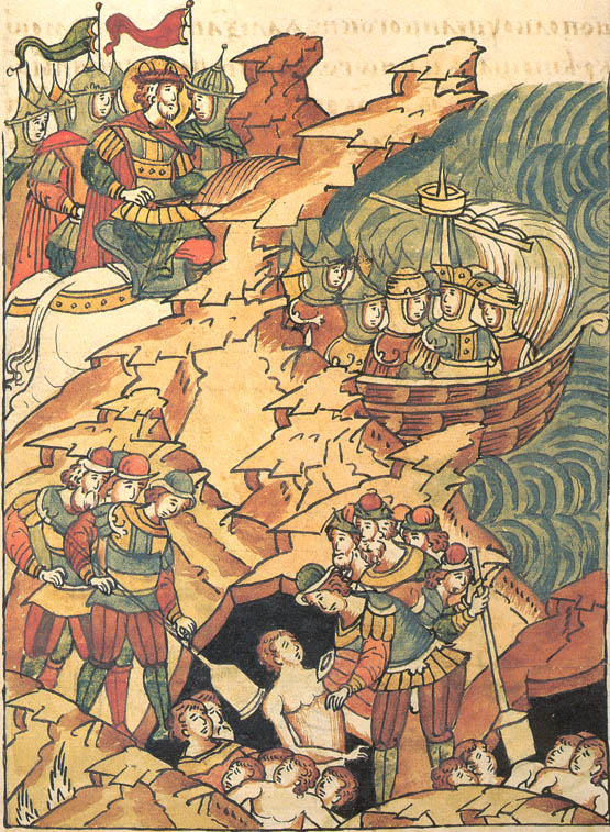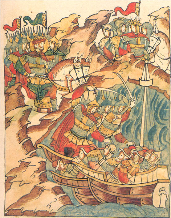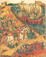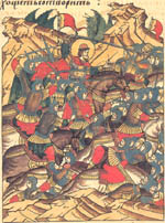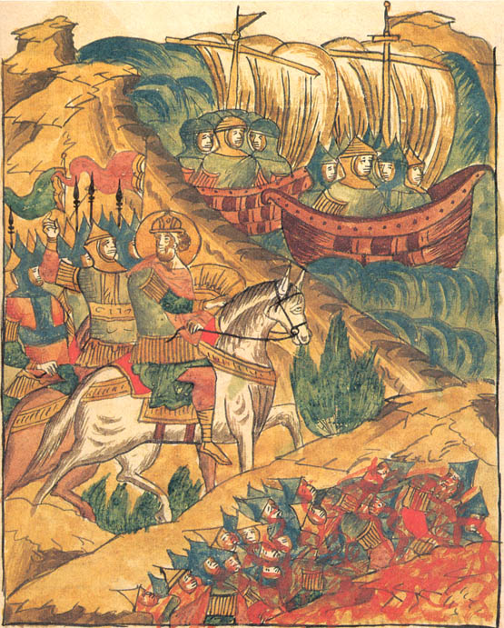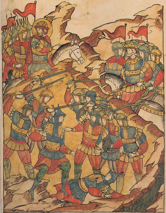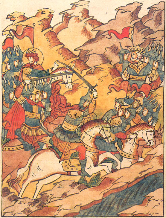And so, hastening still more, he encountered the enemy in the sixth hour of the morning. And there was a great battle with the Romans, and infinite numbers of them were slain. And the Prince set his seal, with a sharp sword, on the face of the king himself. And here, too, six men of valor who battled gallantly by his side distinguished themselves among the troop of Grand Prince Aleksandr.