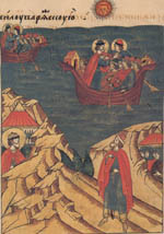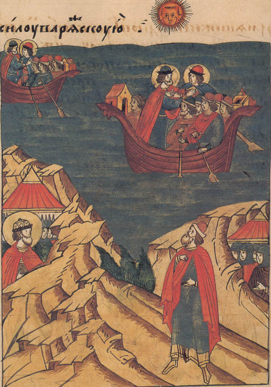 He stopped by the edge of the sea, watching both the ways, and kept awake all night long. And as the sun began to rise, he heard an ominous noise coming from the sea. And he saw a single rowing-boat approach; and standing in the middle of the boat were the holy martyrs Boris and Gleb in scarlet robes, their hands laid on each other's shoulders. And the oarsmen sitting in the boat seemed to be clothed in darkness. And Boris said to Gleb, "Brother Gleb, do command them to pull harder, that we may aid our kinsman, Grand Prince Aleksandr Iaroslavich." Seeing this vision, and hearing these words of the holy martyrs Boris and Gleb, Peigusy stood trembling in great fear until the boat had moved out of his sight, going towards [Valaam].