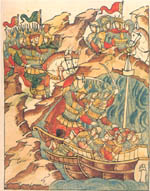 The fifth was of the Prince's junior troop, a certain Savva. This one, dashing into the king's great gold-roofed tent, cut down the pillar, and the tent collapsed. And the troops of Grand Prince Aleksandr Iaroslavich, seeing the tent fall, rejoiced.