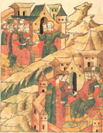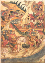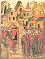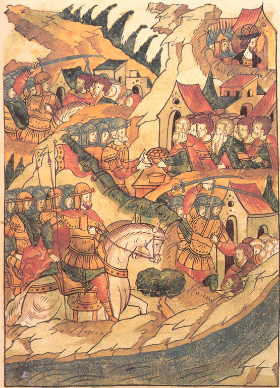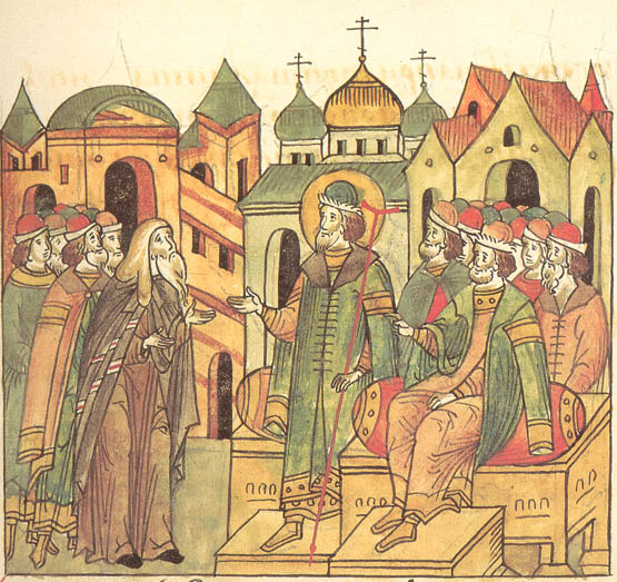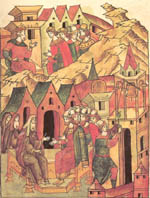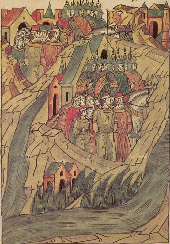 And Archbishop Spiridon, with the aforesaid nobles and eminent citizens of Novgorod, did wait upon Grand Prince Iaroslav Vsevolodovich in Vladimir, petitioning him, on behalf of the whole of Novgorod, that he send Grand Prince Aleksandr Iaroslavich to rule over Novgorod. And he laid the blame entirely on the men of Novgorod, saying that "they did wrong to raise so great a strife, and to quarrel with your son, Grand Prince Aleksandr. And we wish you would put aside your displeasure against Novgorod the Great in this matter, and send us again your son Aleksandr to rule over us."