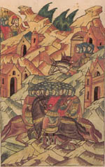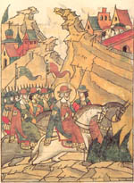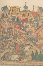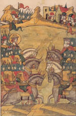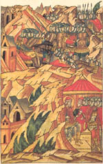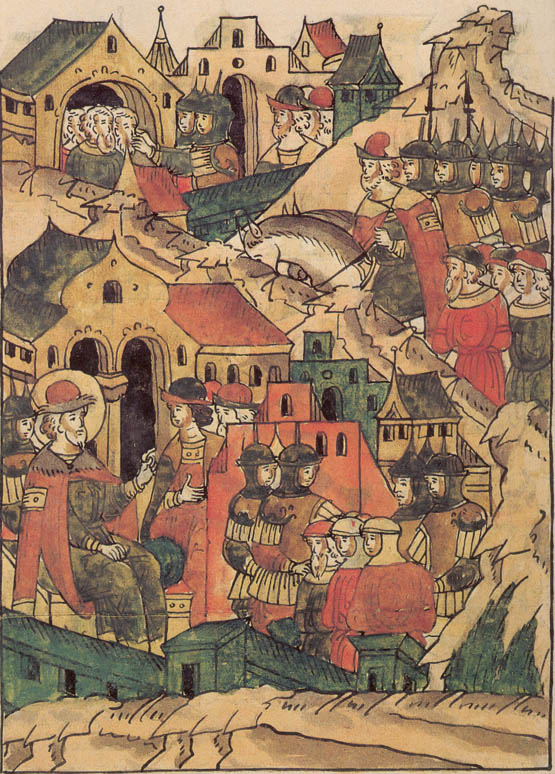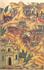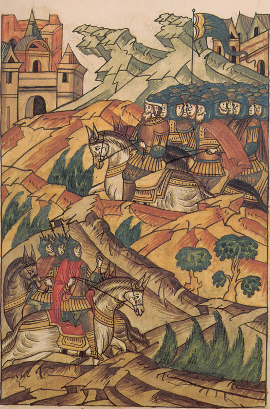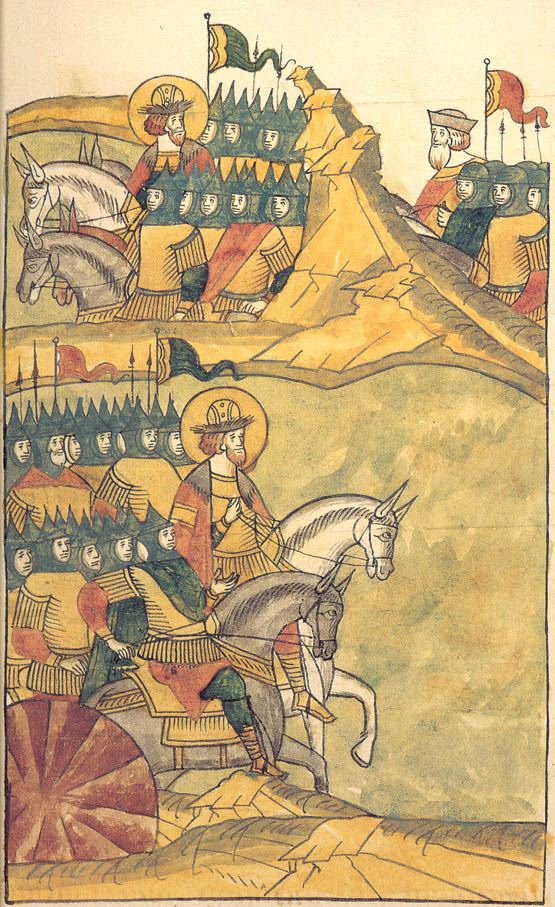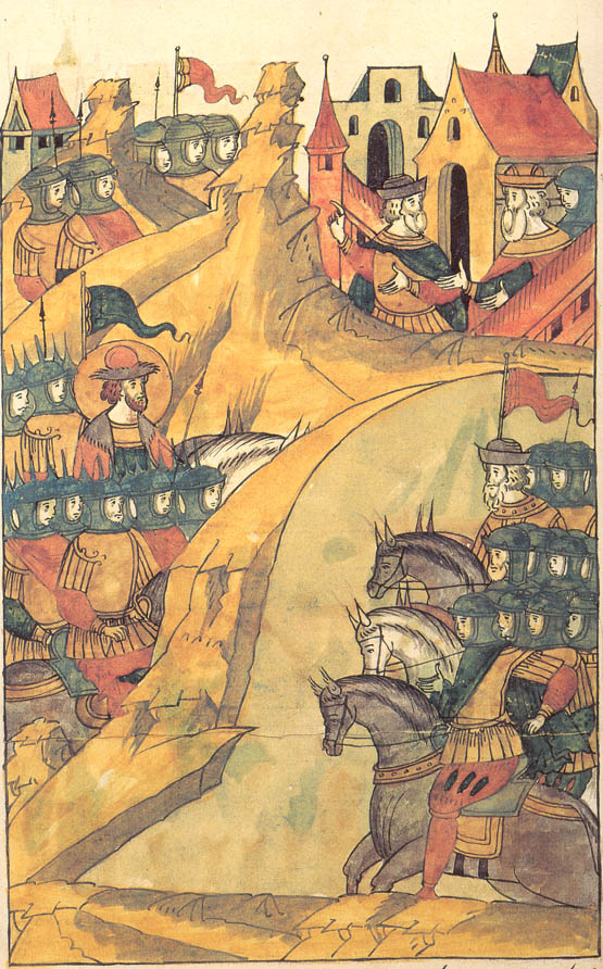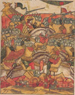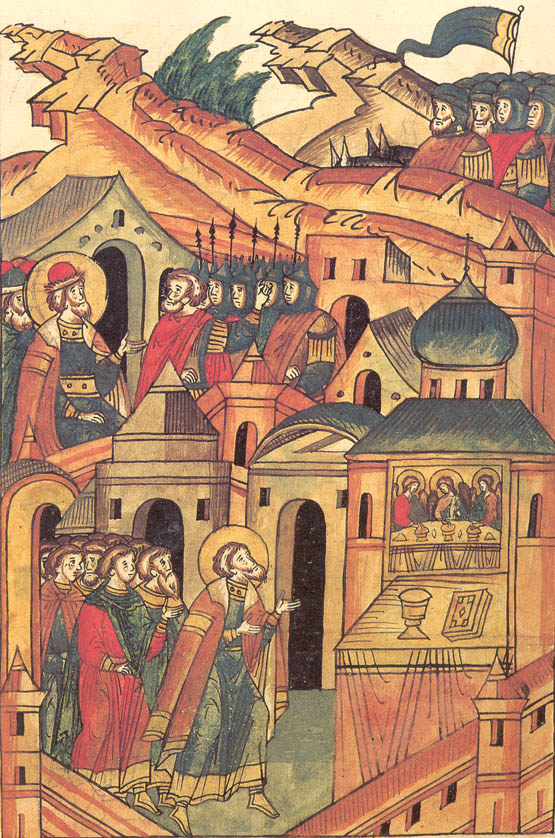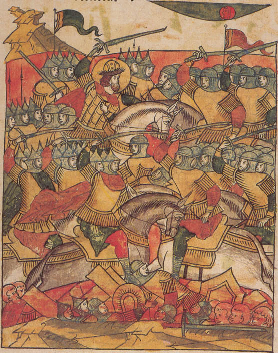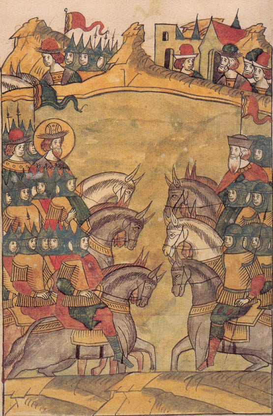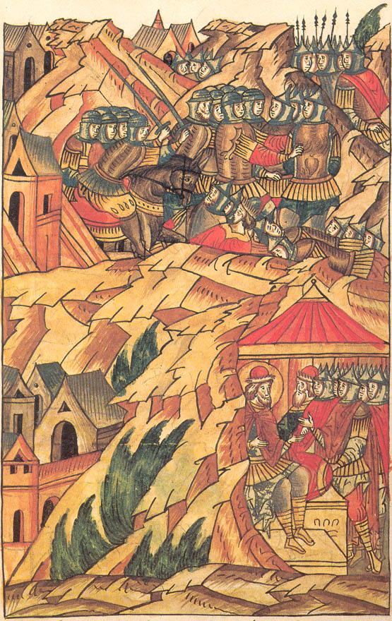 And having strengthened himself by the power of the cross, and ordered his men, he marched against the enemy. And they joined battle upon Chudskoe Lake. Now, there fought, on either side, great multitudes: for his father, Grand Prince Iaroslav Vsevolodovich, had sent to his assistance his younger brother, Prince Andrei, in command of many warriors of his own troop. And so Grand Prince Aleksandr had multitudes of mighty and experienced warriors, like King David of old -- and as strong and staunch. And like them, the warriors of Grand Prince Aleksandr were filled with a martial spirit; for their hearts were like lions' hearts. And they said, "O our Prince, esteemed and well-beloved, the time has now come: we will lay down our lives for your sake." And Grand Prince Aleksandr, lifting up his arms towards heaven, spoke thus: "O God, judge Thou and give sentence in my quarrel. Help me, 0 Lord, against this boastful nation, as Thou didst help Moses against Amalek in the days of old; and my great-grandfather, Prince Iaroslav against Svyatopolk the Accursed."