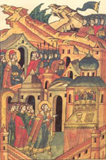 to see such a numerous host, and reported to Prince Aleksandr Iaroslavich. And on hearing of this, he was aggrieved, and went to the Church of the Holy Trinity, and prayed, weeping and shedding tears.