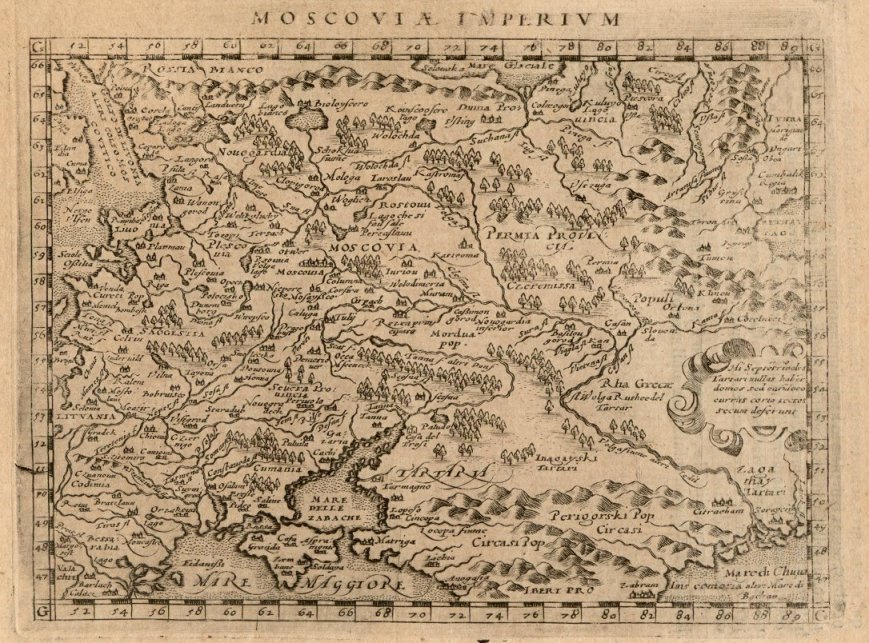 I spent a weekend this past Fall in Philadelphia for a funeral and (mostly in an attempt to cheer myself up) I went shopping at the antique stores. At one of these in Chestnut Hill, I browsed through a collection of "Russian" prints. Expecting to find a lot of 19th century junk, I had fairly low expectations. But then I came across this map (an original piece from 1597).