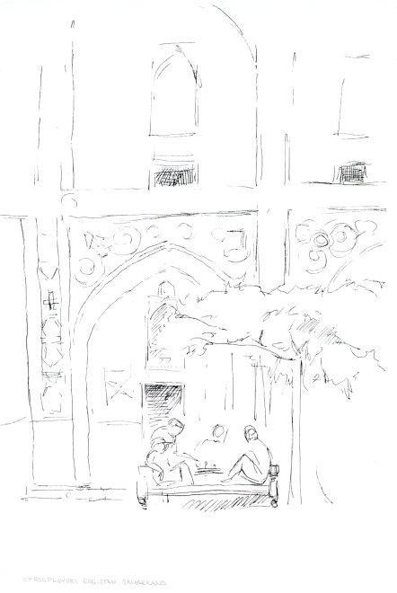 We walked among the sad ruins. Only one building remains, this in the graveyard of Shahr-I-Zindah, being the tomb of the cousin of the Musselman profit, named Qusam ibn-Abbas. Why Ghenghis Khan spared this shrine, I do not know. We saw also ruins of a palace from a time when the people of the city were idol worshipers. Here are the remains of a very beautiful mural with rich blue pigments showing ambassadors from every nation even to the land of India paying tribute the king. But the roof is caved and burnt and much of it covered with soil.