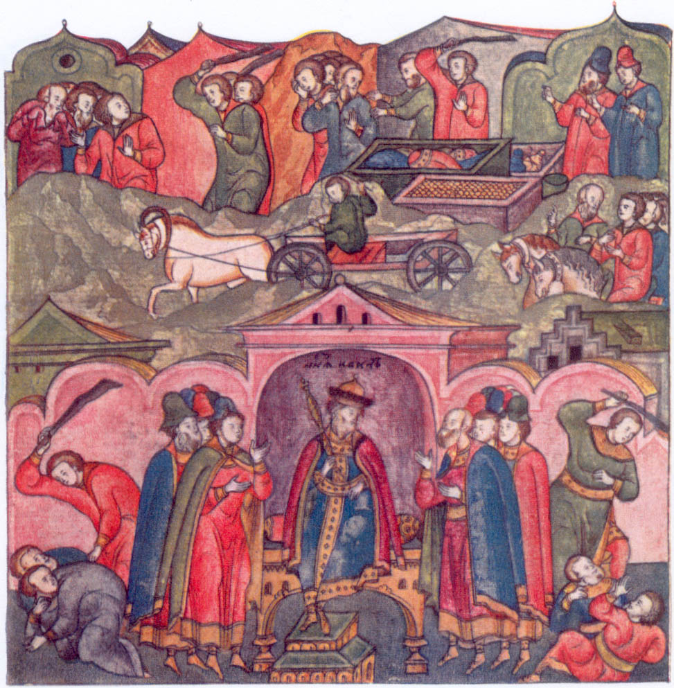 In the center we have Ivan Danilovich Kalita, surrounded by boiars. Outside of them we see senior servants carrying out Ivan's violent wishes. Above, we see the chaos of the surrounding city from Ivan's orders.