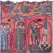 This depicts the torture and punishment of Averkii by Moscovites. Above are shown the worried people of Rostov witnessing the tragedy.