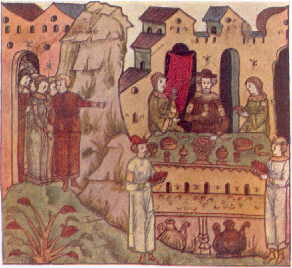 Illustrating a scene from Genesis 26: 30-34 depicting the feast for the marriage of Esau to Judith and Basemath (seated with him at the table). Servants attend and wedding guests are at the door.