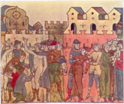 Illustrating a scene from Genesis 35: 24: "And all who went out of the gate of his city listened to Hamor and to his son Shechem, and every male was circumcised, all who went out of the gate of his city."