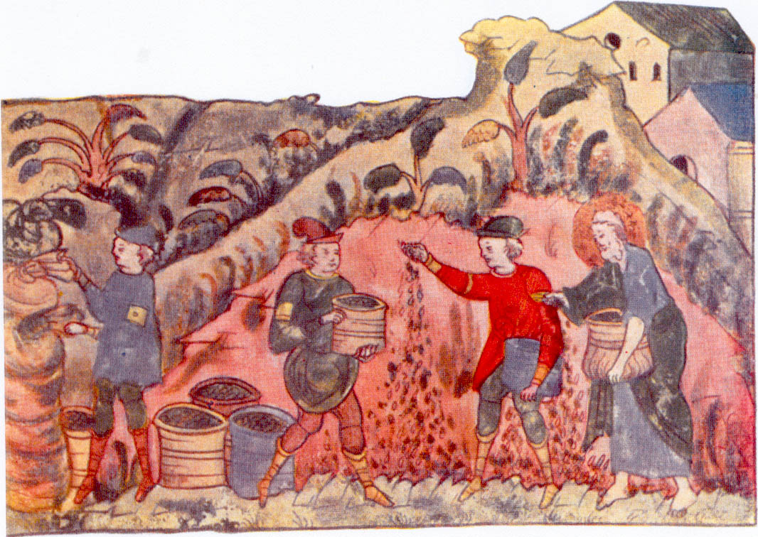 Illustrating a scene from Genesis 26:12: "Now Isaac sowed in that land, and reaped in the same year a hundred fold."