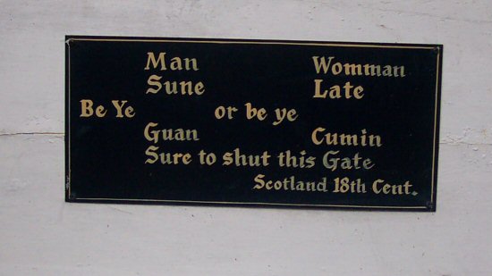 "Be ye man or be ye woman/Be ye soon or be ye late/Be ye going or be ye coming/Be ye sure to close this gate."